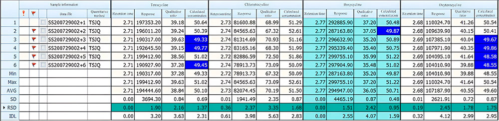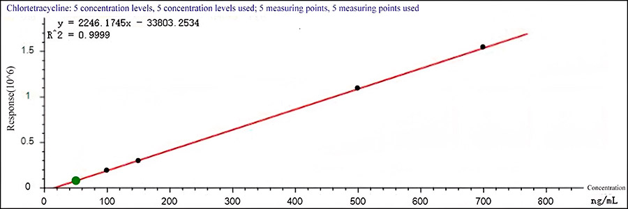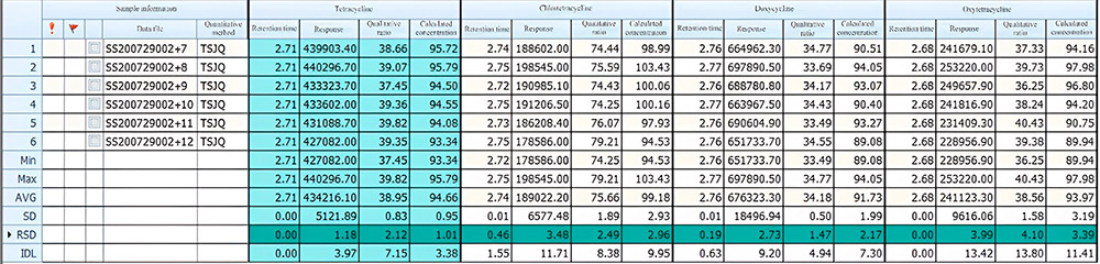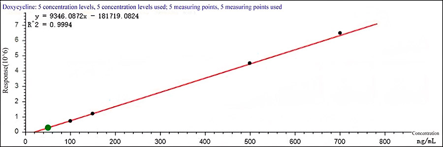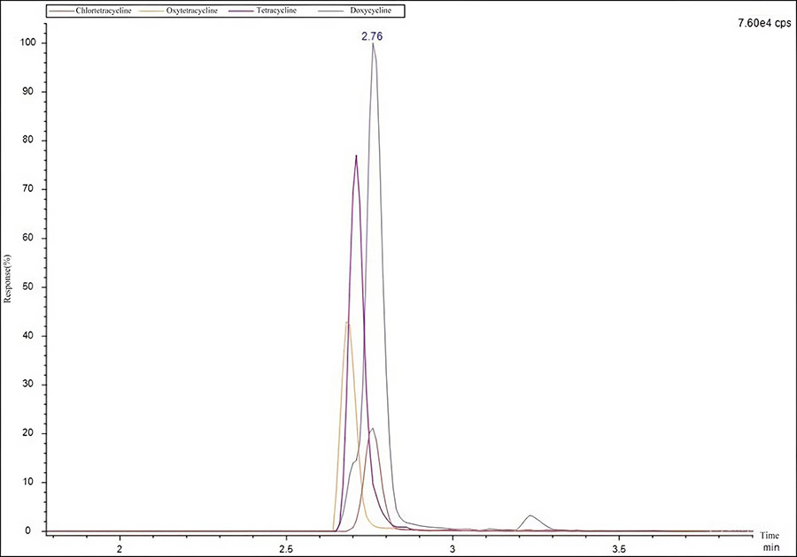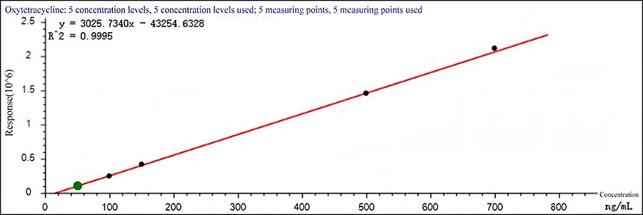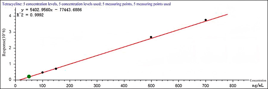 После экстракции образцы молока подвергаются дополнительной очистке с помощью твердофазной экстракционной и определяются с помощью системы ВЭЖХ-МС/МС. Проведено исследование линейности, повторяемости и чувствительности метода анализа тетрациклинов в молоке с использованием УВЭЖХ-МС/МС. Полученные данные отражают линейность построенной калибровочной кривой для антибиотиков группы тетрациклинов в диапазоне обнаружения, с коэффициентом корреляции более 0,99; отклонение сходимости результатов метода находится в пределах 3.99%. Система EXPEC5210 может быть использована для эффективного количественного определения остаточного содержания антибиотиков группы тетрациклинов в молоке.