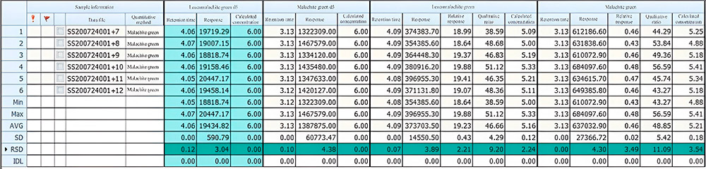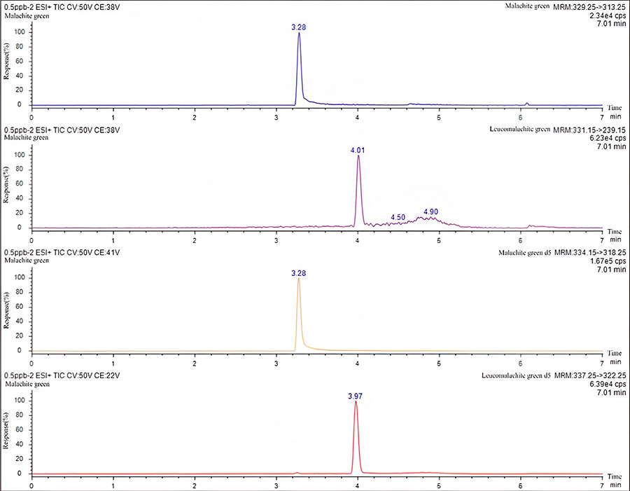 Разбавление стандарта проводилось ацетонитрилом для достижения серии стандартных растворов (0,5 мкг/мл, 1 мкг/мл, 5 мг/мл, 10 мг/мл и 50 мкг/мл) малахитового зеленого. Концентрация внутреннего стандарта малахитового зеленого-d5 и лейкомалахитового зеленого-d5 составляла 6 мкг/мл.